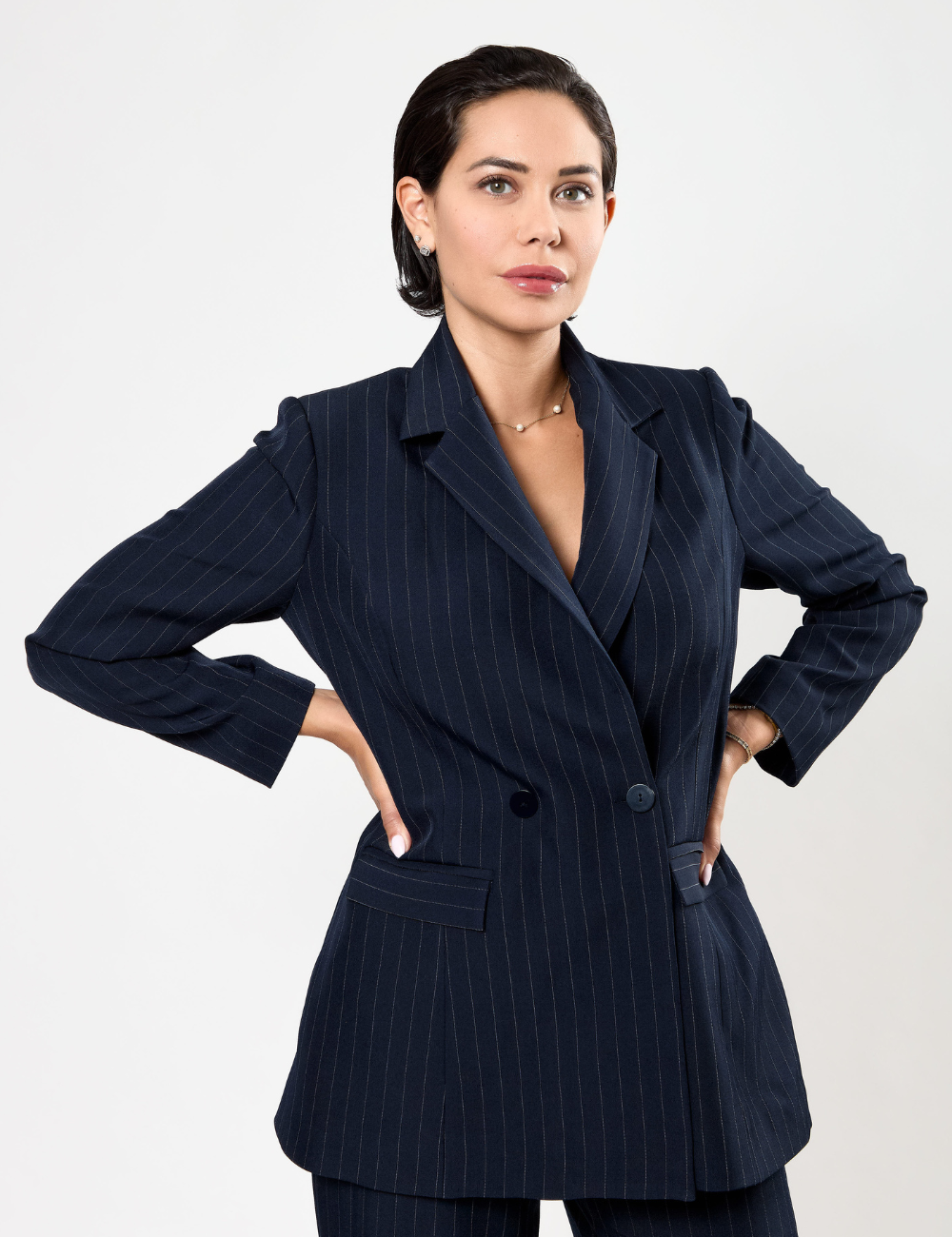 Veste tailleur moderne et féminine, croisée à col tailleur, poches passepoilées et ceinture amovible.