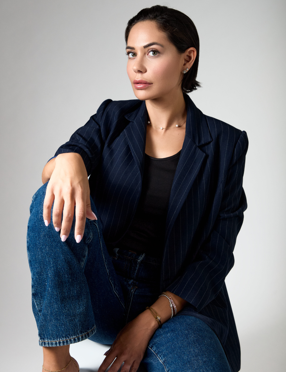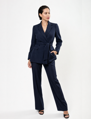 Veste tailleur moderne et féminine, croisée à col tailleur, poches passepoilées et ceinture amovible.