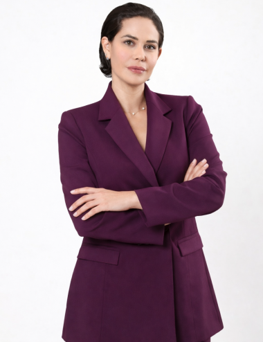 Veste tailleur moderne et féminine, croisée à col tailleur, poches passepoilées et ceinture amovible.
