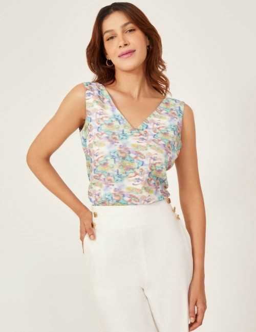 Un basique pour votre garde robe estivale, notre Amani Top sans manches, présente un décolleté en V à l'avant, carré à l' arrière. Son imprimé multi couleurs s'associera bien avec un pantalon blanc, noir ou un jean ! Disponible également en imprimé et bleu roi.